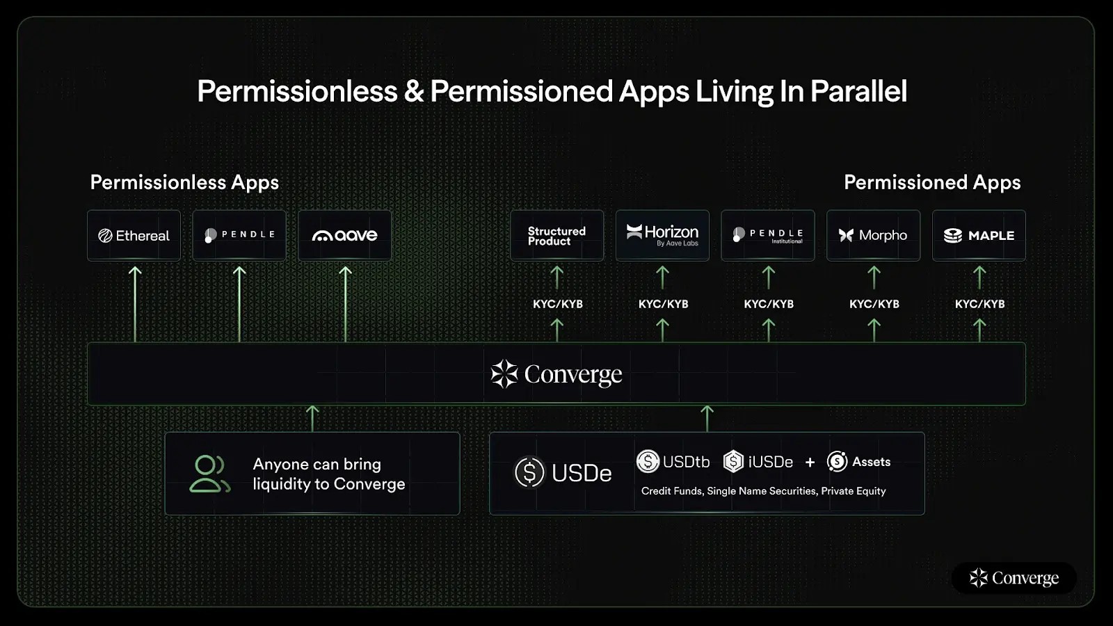 Converge:巧妙融合传统金融和 DeFi 应用Converge是一条很有意思的区块链,它最大的特点就是”双重性”——既可以是完全开放的DeFi乐园,也可以是严格合规的金融平台,用户可以根据需要选择不同的模式。想象一下,同一条公链上,散户可以自由地参与各种DeFi挖矿和交易,而银行和基金等机构则可以在合规层面进行受监管的数字资产业务,两者互不干扰但又能互相受益。在费用方面,Converge支持用USDe和USDtb这些稳定币直接支付手续费,成本完全可控。这种设计特别适合那些想要同时服务散户和机构客户的项目——散户用户可以享受DeFi的高收益和创新玩法,机构用户则可以在满足合规要求的前提下参与数字资产投资。简单来说,Converge想要打破传统金融和DeFi之间的壁垒,让两个世界能够和谐共存并相互促进。